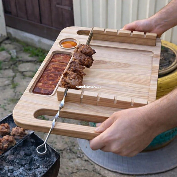 Букова дошка для подачі шашлику — це ідеальний вибір для смачних страв на відкритому повітрі. Вона має окремі відділення для соусу, що забезпечує зручність подачі та гармонійний вигляд. Міцна та елегантна, така дошка стане чудовим доповненням до будь-якої вечірки чи пікніку.