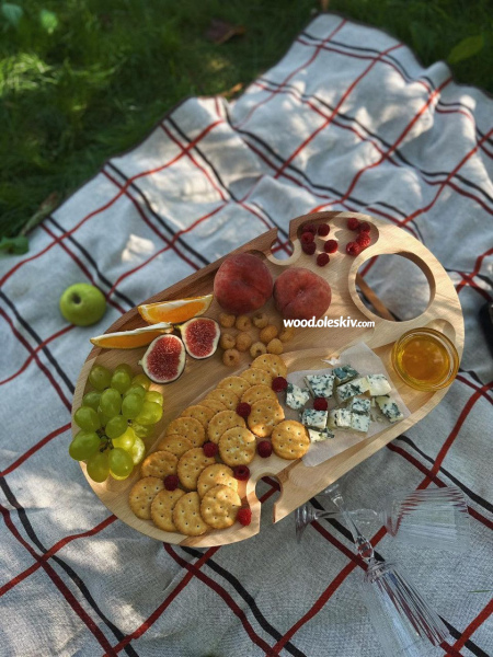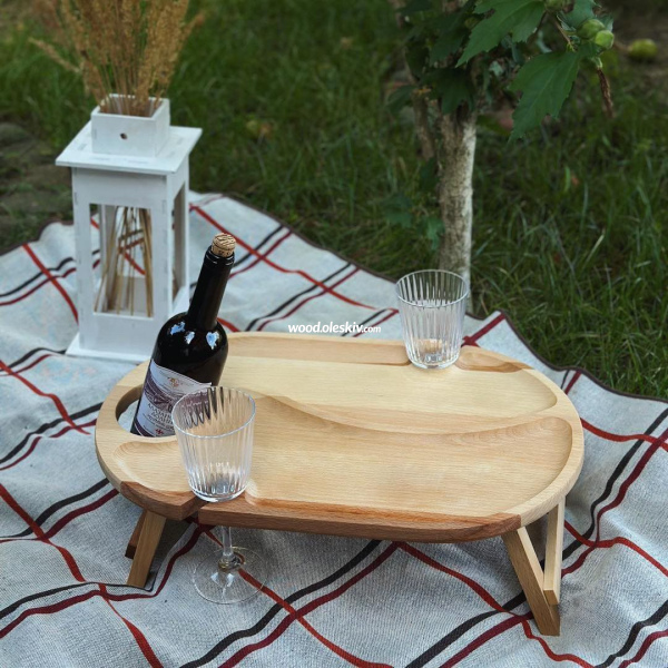 Цей столик-піднос ідеально підходить для використання в ліжку чи на природі. Він має зручну конструкцію, що дозволяє комфортно розміщувати смаколики та 2 келихи вина. Легкий, компактний і стильний, він стане незамінним супутником для відпочинку та релаксу