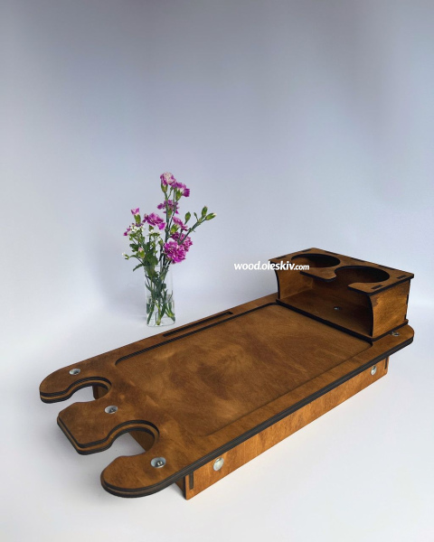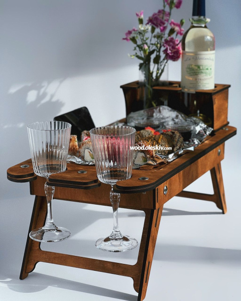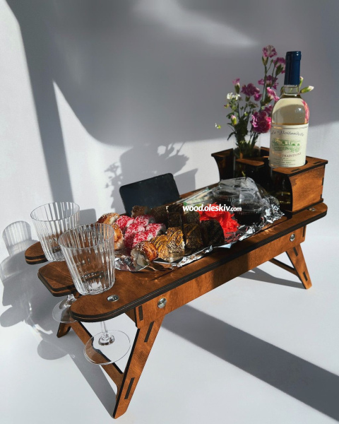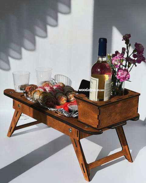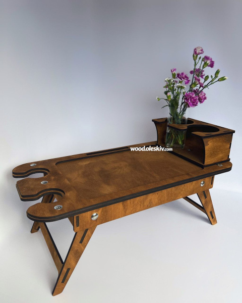 Загальний: 58х28см Місце для ноутбука/смаколиків: 36х23см Діаметр для пляшки/кружок: 9см Діаметр для келихів: 4,5см Висота ніжок: 22см |
