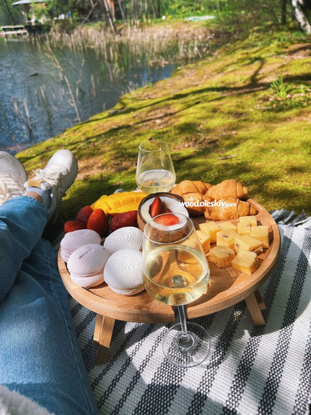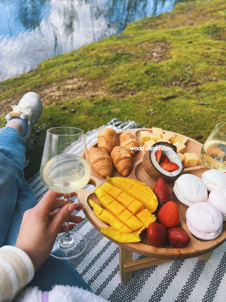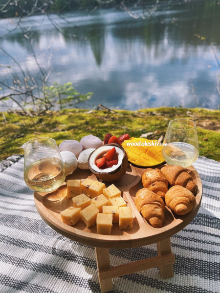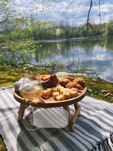 Маленький круглий винний столик виготовлений з бука, ідеально підходить для двох келихів та пляшки вина. Його компактний розмір та елегантний дизайн створюють затишну атмосферу для вечері або романтичного вечора