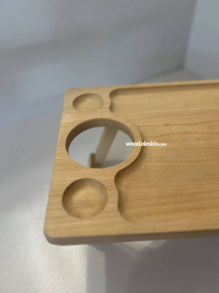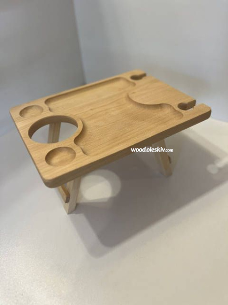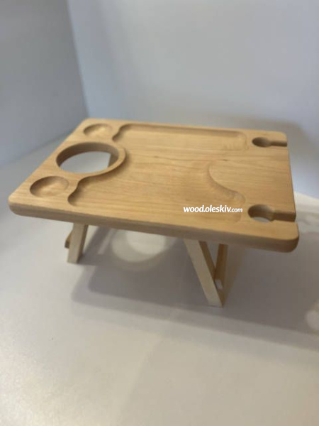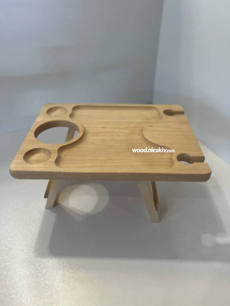 Цей столик-піднос ідеально підходить для використання в ліжку чи на природі. Він має зручну конструкцію, що дозволяє комфортно розміщувати пляшку вина, смаколики та 2 келихи. Легкий, компактний і стильний, він стане незамінним супутником для відпочинку та релаксу